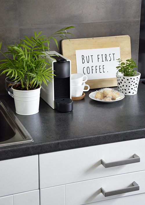 Egészen más az összhatás, mint korábban. Mivel maga a kávégép tényleg nem foglal sok helyet, hihetetlenül vékony, így még 1-1 kisebb zöld növény is elfért mellette, ami szerintem nagyon jól mutat a monokróm környezetben. Most a pult közepén helyezkedik el a mini kávézóm, de amint sikerül a mikrót száműznöm valamelyik szekrénybe, véglegesen átveszi annak helyét a sarokban.