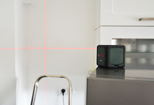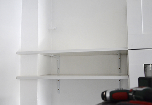 A polcok helyének kiméréséhez és vízszintes felhelyezéséhez a lézeres szintezőm volt segítségemre, ami a gardróbom polcainak kimérésénél (ITT) is jól jött. A kiszabott polcokat ugyanolyan fehér konzolokkal rögzítettem, mint korábban a közlekedő háztartási- és barkácshelyiségében, ITT.
