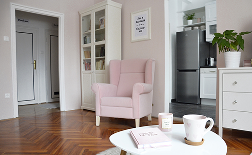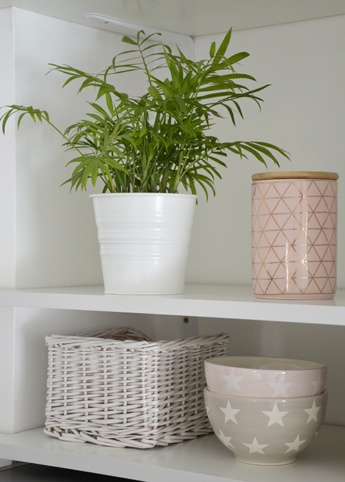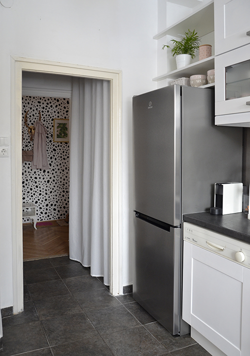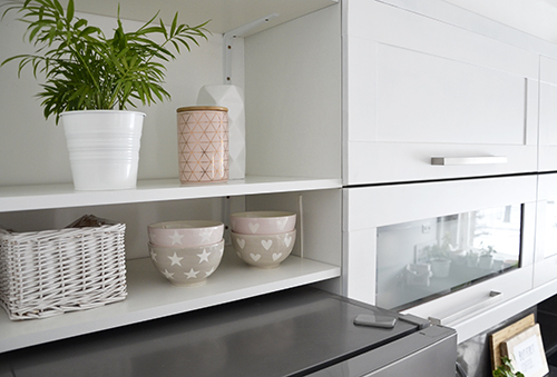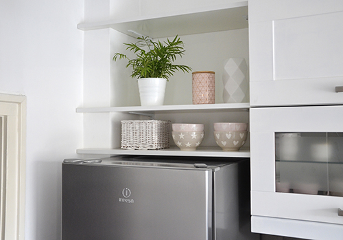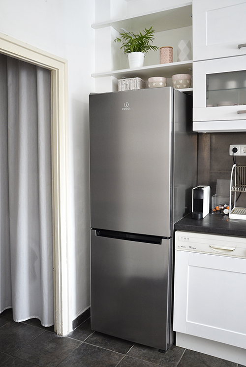Alapos takarítás után a hűtő is visszakerült a helyére, a polcokon pedig helyett kapott néhány stílusban passzoló dolog. Elsősorban olyanok, amiket nem használok nap mint nap, hisz a polcok a hűtő miatt elég magasan vannak. A müzlistálakat éppen elérem: