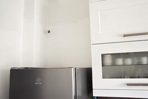 Itt korábban egy magas szekrény volt beépített sütővel, de amikor a víznyomó csövet cserélték, a szekrényt kibontották, amit én már nem építettem vissza. Sokkal praktikusabbnak éreztem, hogy a hűtő kapjon itt helyet.