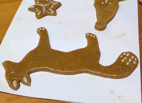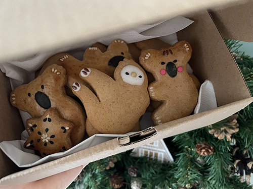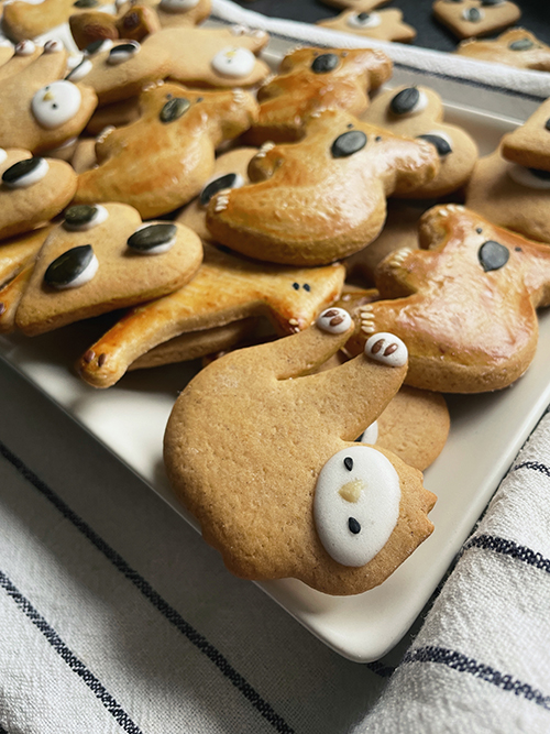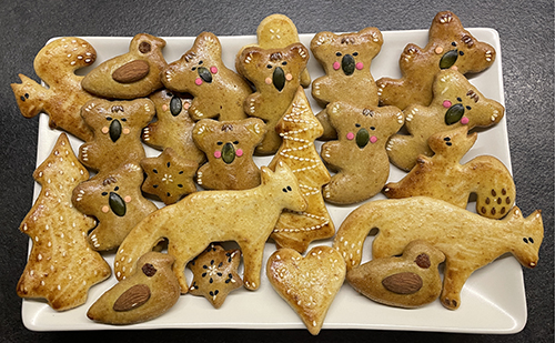 Idén a formák között volt egy koala is, amire először nem ugrottam rá, de amikor láttam, milyen jól mutat kisütve, hát gyorsan lecsaptam rá és készítettem párat, tökmag nózival és kis piros cukorkonfettivel a pofiján. A formákat egyébként úgy sütjük, hogy mindig feltöltünk egy-egy tepsit vegyesen, úgyis tudjuk, hogy ki melyiket készítette. Miután kihűltek, mindenki kiválogatja a sajátját.