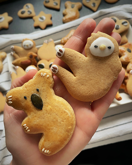 A koalákat sütés előtt díszítettem, a lajhárokat pedig sütés után cukormázzal és abba nyomtam a magvakat. Annyira jópofa lett, hogy a barátoknak is ezt adtam ajándékba.