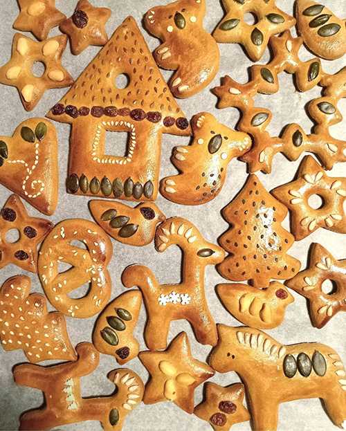 Szeretünk lenmaggal, tökmaggal, szezámmaggal, napraforgómaggal, mazsolával, dióval, mandulával dekorálni, amiket szaggatás után tojássárgájával megkent felületre helyezünk és ezután megy a sütőbe.