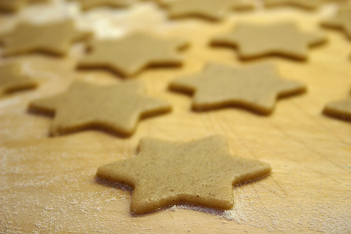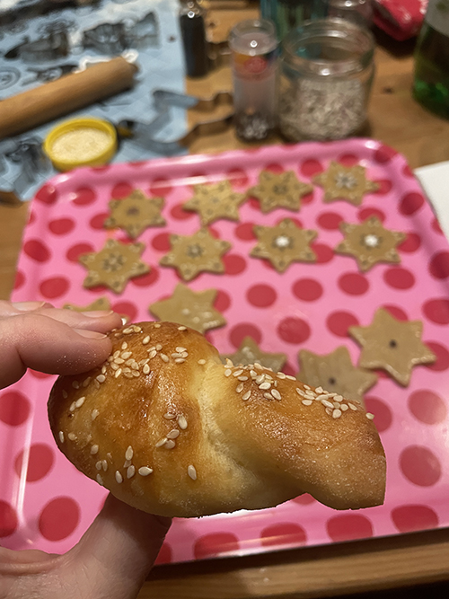 A tojástól természetesen fényesebb lesz a felület, mikor kisült. Lehet egyébként cukorformákat is rátenni, viszont ezzel vigyázni kell, nem mindegyik bírja a sütést, ki kell tapasztalni. Ezek a kis hópelyhek jól bírták:
