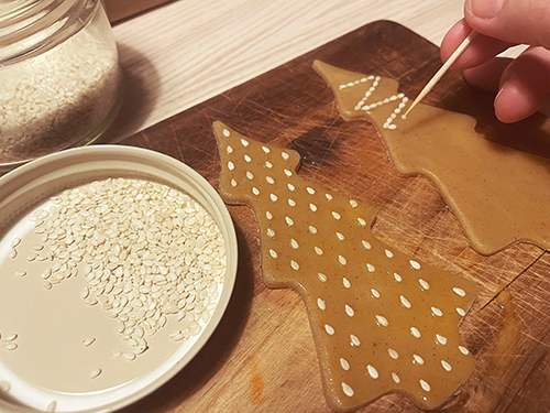 A kiszaggatott mézeskalács formákat tojással kell bekenni (mi úgy szoktuk, hogy fehérje+sárgája összekeverve), és erre kell helyezni a mindenféle magvakat: szezámmag, lenmag, napraforgómag, tökmag, fenyőmag, mák vagy ami éppen van otthon a háztartásban. Célszerű fogpiszkálót használni, néha ennek a végét is tojásba kell pöttyinteni, hogy feltapadjon rá a kiválasztott magocska.