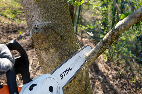 A kertkaputól felfelé haladva, főleg a kerítés menti részeken nagyon sok elszáradt, vagy kiálló és így balesetveszélyes kisebb-nagyobb faágat kellett végre hatékonyan kezelésbe vennem. Korábban a kézifűrésszel ez elég hosszadalmas és fáradtságos időtöltés volt, 2-3 ág lefűrészelése után általában fel is adtam a dolgot.