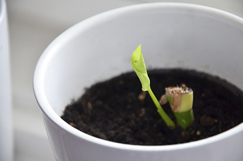 Amikor már látszik a fejlődésnek indult fehér gyökérke, akkor szoktam földbe tenni. A legutóbb levágott és vízben nevelgetett kis töveket már olyan földbe ültettem, amibe tápanyagdús komposztföldet is kevertem. Ezért is jó a közösségi komposztálónk (ITT), mert az ebből nyert komposztfölddel a tápoldatozást kiválthatom.