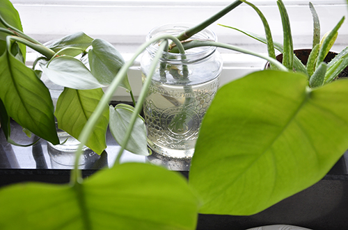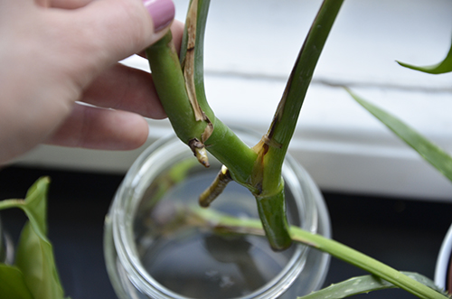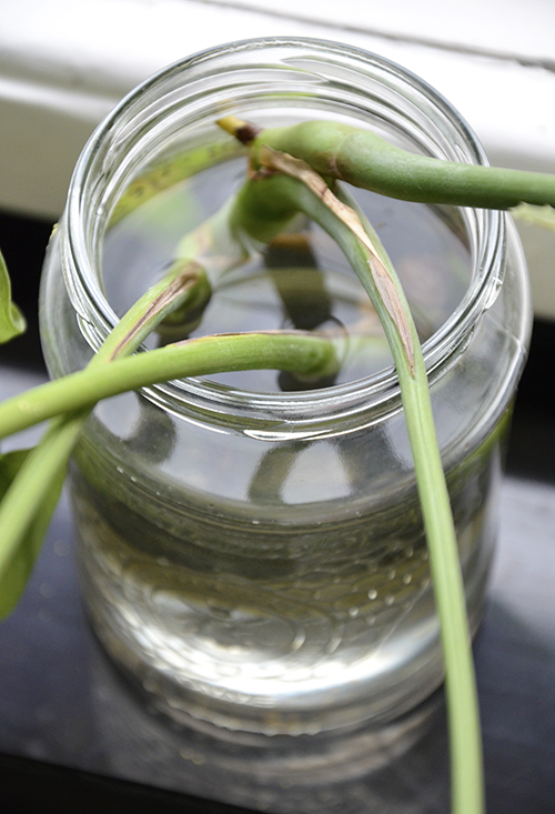 Magáról a monstera szaporításról sokféle cikk van fent (pl. EZ vagy EZ), de én inkább Anyukámat is megkérdeztem, aki ugyan nem növényszakértő, de általában ösztönösen és tapasztalatból jól bánik a növényekkel. Ő azt tanácsolta, hogy ne féljek a megnyúlt, a levelek súlyától már oldalra dőlt szár elvágásától, csak legyen éles a vágás (ne trancsírozzam szét a szárat), és mindig úgy vágjam, hogy legalább egy ízesült szárrész legyen a kezemben (ez azoknak is tanács, akiknek fel van kopaszodva a szár), amit aztán vízbe tudok tenni és gyökereztetni. A homokos földben való gyökereztetés eddig csak egyszer jött össze, vízbe téve viszont eddig mindig sikerrel jártam.