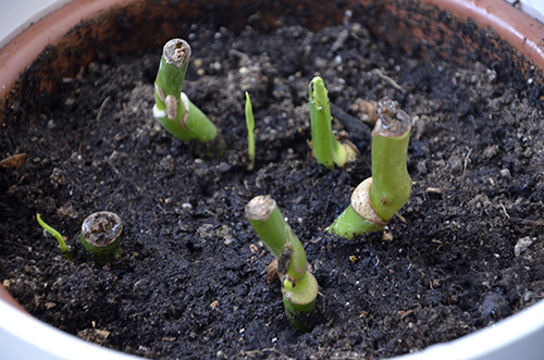 Itt van pl. ez a darab, ami a szár legfelső részéből lett levágva, és összesen három levél van rajta. A szárat egészen kis darabokra is lehet vágni, én van, hogy egészen tövig visszavágom, hisz a földben maradó rész is előbb-utóbb hoz új hatást: