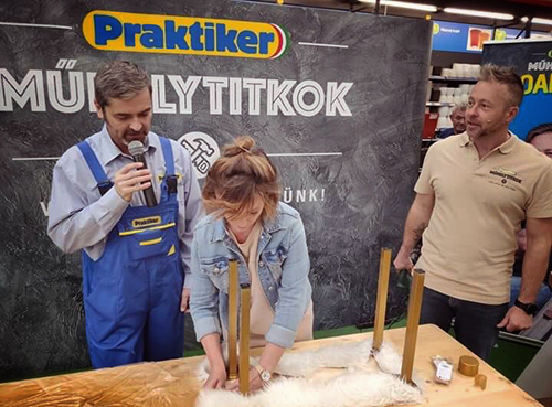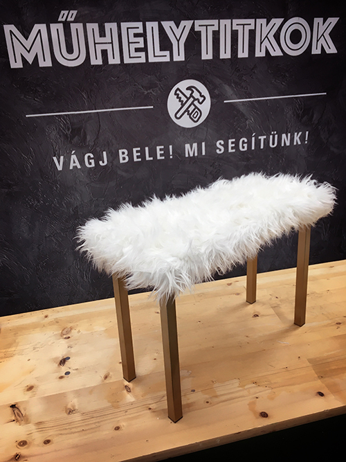 Már akkor szemeztem a műszőr szőnyegekkel, amikor Márkkal és Rolanddal a Praktiker szombathelyi Műhelytitkok roadshow-ján együtt barkácsoltunk össze egy olyan ülőkét/lerakót, amire fehér szőrmét rögzítettünk kapocsbelövővel.