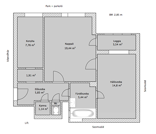 Remek elrendezés, 2 egész szoba, loggia, tágas terek, 2.85 belmagasság, nagy ablakok és még kamrám is van, sőt, pincém is. Az elektromos hálózat ki van cserélve, hurrá!