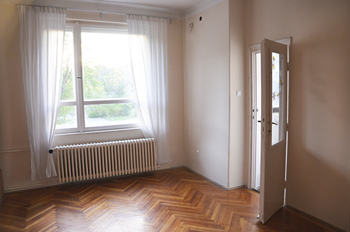 A nappali 20 nm, innen nyílik a loggia és a háló. A szobának hatalmas aszimmetrikus duplaszárnyú fa ablaka van, amibe azonnal belszerettem, ahogy a parkettába és a régi vasradiátorokba is. Ez inkább négyzetes elrendezésű (a korábbi lakásomban téglalap volt), úgyhogy itt a bútorokkal jobban kell okoskodni.