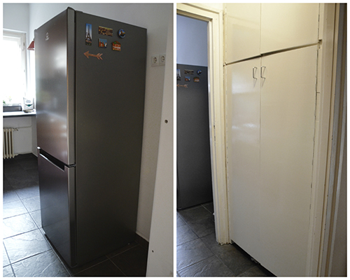 Vettem egy nagy hűtőt, olyat, amilyen a felnőtteknek van (hahaha), és ez most a konyha másik felén árválkodik, belóg a térbe, ami kicsit zavaró. Úgyhogy, mivel amúgy is lesz strangcsere a beépített sütő elem mögött (ebben már rutinos kismókus vagyok, nem ijedek meg holmi kis lakásban történő falbontástól), oda fogom berakni a hűtőmet, a sütőt meg áttelepítem, de erről majd úgyis írok később. Kicsit messzebbről fotózva látszik a beépített szekrény is a kisközelekedőben: