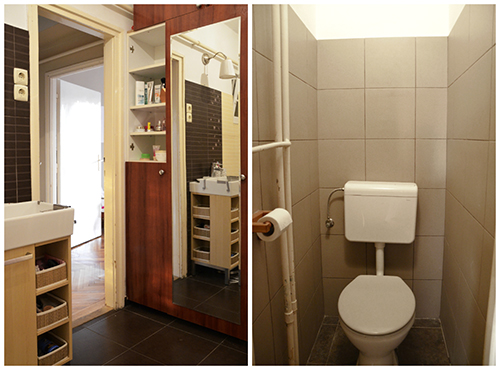 A fürdőben egyébként szintén van egy sokmindent elnyelő szekrény, ha a fürdőnek nekiesek egyszer, ezt is újragondolom majd. A helyiség amúgy kétbejáratos, innen az előszobába lehet kimenni, ami nagyon praktikus.