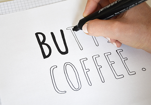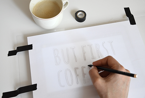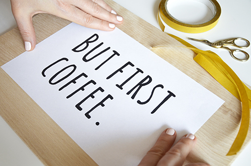 Példának nézzük a konyhai BUT FIRST COFFEE deszkámat, aminek elkészítéséhez mindössze egy vágódeszka alapra, fehér papírra, fekete filcre (alkoholos vagy akril) ceruzára, ollóra, sniccerre, kétoldalas ragasztószalagra, egy műanyag fóliára és egy laptopra/tabletre van szükség.