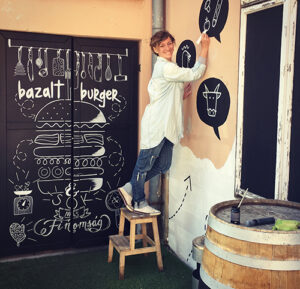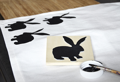A festéket többféleképpen is fel lehet vinni a dekorgumira, én mindig ecsettel szoktam, inkább vastagon, mint vékonyan, és minden nyomdázás előtt újrakenem a felületet. Ha túl vékonyan kenitek a festéket, akkor a nyomat kicsit foltos lehet, de igazából ez is jól állhat a textilnek, attól függ, mi a cél.