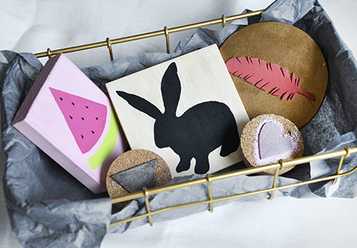 A nyusziformát ráfestettem a fa alap tetejére akrilfestékkel, majd az egészet matt lakkal lelakkoztam. A dekorgumiból kivágott formát a másik oldalra ragasztottam (ügyelve, hogy pont úgy legyen, ahogyan a túloldalon a felfestés van!)