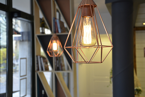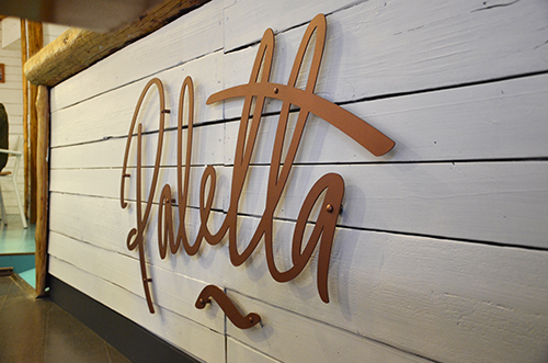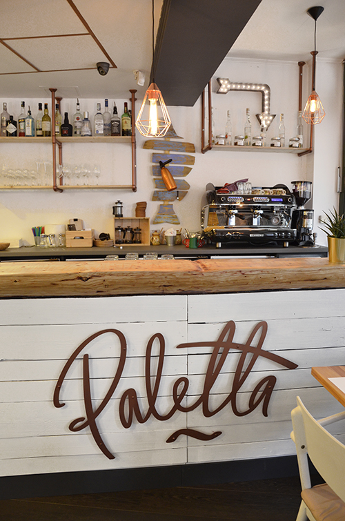 A fehér, a natúr fa, és a „balatonkék” mellé még kellett valami, ami az egészet picit megdobja. Ez lett a réz, ami a lámpatesteken, a pult elejére vágatott Paletta logoban, és a polctartó konzolokon is megjelenik.