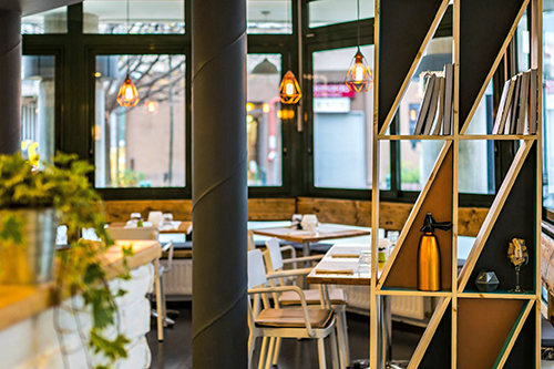 Nagy fejtörést okozott a dobogó feletti kazettás álmennyezet (tiszta 20 évvel ezelőtti iroda hatás), ami fölé a légkondi és a mindenféle elektromos vezetékek vannak rejtve. A legtutibb megoldás az lett volna, ha az egészet lerobbantjuk és újracsináljuk, erre viszont nem volt időnk a tervezett nyitásig. Ezért azt találtuk ki, hogy az alu síneket is átfújjuk réz hatásúra, sőt a lámpatestek szélét és még a megsárgult műanyag légkondikat is! Így picit belesimul a térbe, annyira nem is szúr szemet, mint azelőtt, bár most, hogy leírtam, tuti mindenki ezt fogja elsőként megnézni, amikor belép, haha.