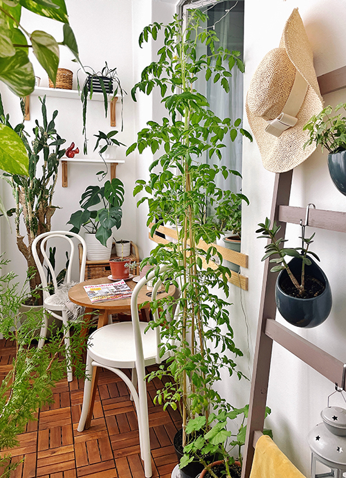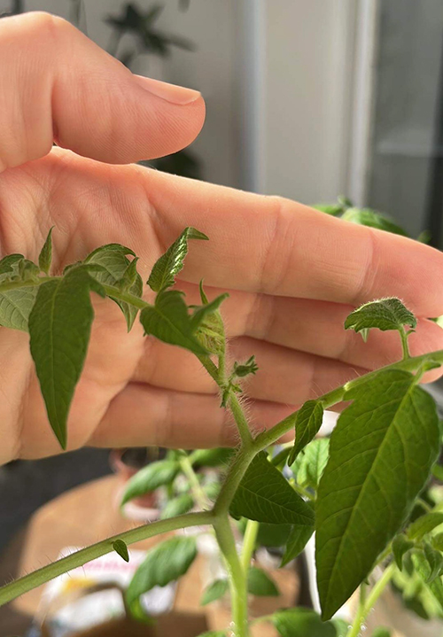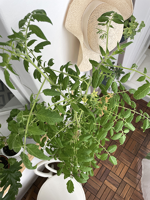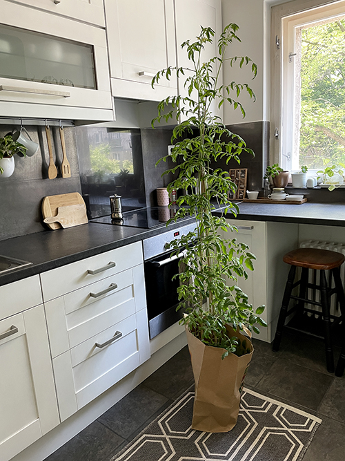 Ezután elkezdtem hurkapálcával „karózni”, mert a szárak csak nyúltak, de nem igazán erősödtek (nem úgy, mint egy kiültetett palánta), viszont egyre több levele lett. Később átraktam őket egy nagyobb cserépbe, a hurkapálcákat erősebb és hosszabb bambuszpálcák váltották fel, és ekkor már kikerült a paradicsom „bokor” (haha) az erkélyre. Áprilisra már velem egymagas volt az egész, de még féltem kiültetni, pedig már virág is megjelent rajta.