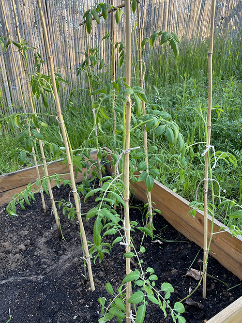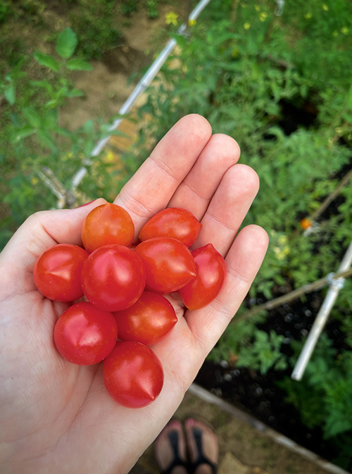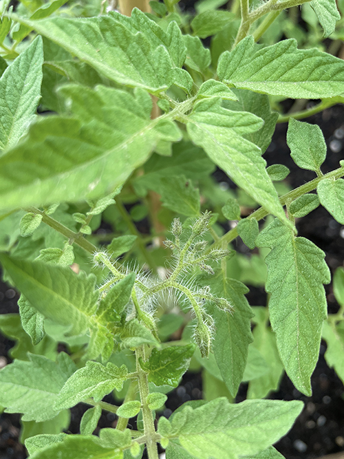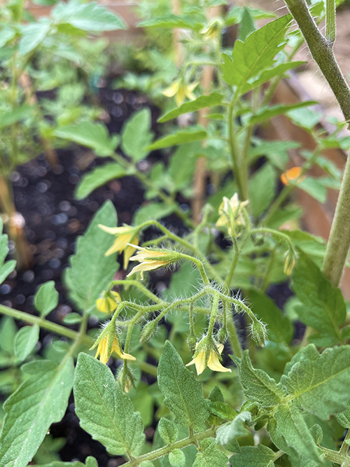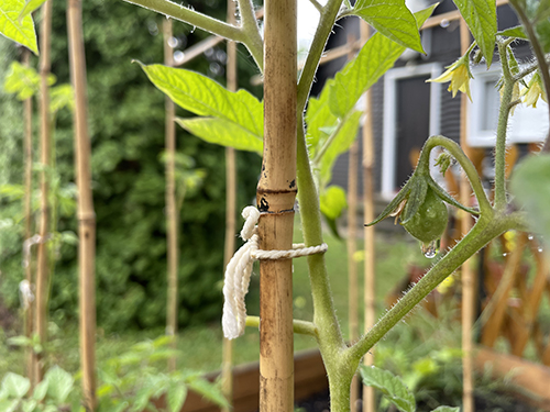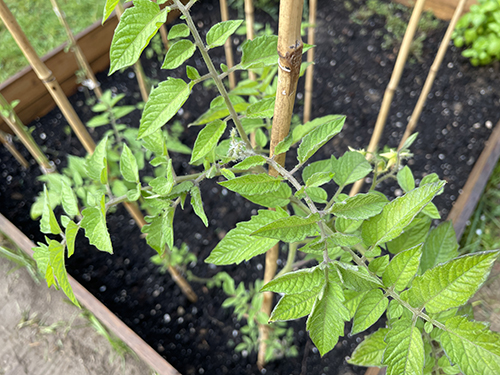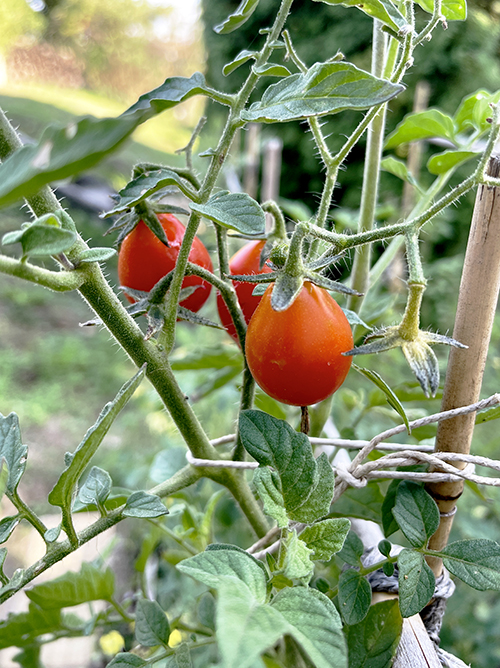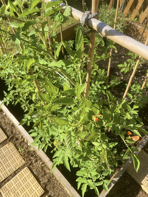A levágott levelek helyén a hónaljhajtások kezdtek el növekedni, de volt olyan levél is, aminek sikerült visszaerősödnie a kiültetés utáni kókadt állapotból. Egyre több virág lett, majd egyre több zöld paradicsom, míg végül júliusban megjelent az első piros termés.