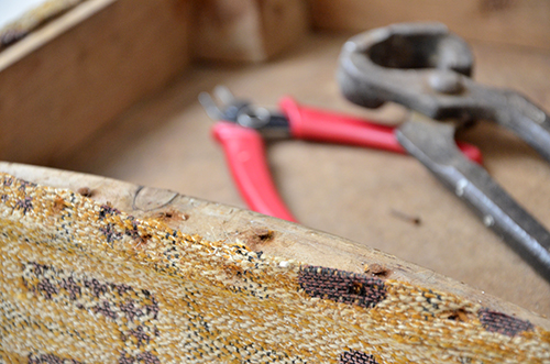 Első lépésként a régi rozsdás szögeket távolítottam el… Nincsen kárpitos bontó szerszámom, de csípőfogóval, harapófogóval, időnként kalapáccsal nagyon jól meg lehetett oldani a dolgot.