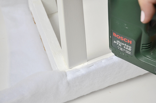Ezután jöhetett az utolsó fázis, a házi kárpitozás. Ehhez rákerült egy új szivacsréteg, majd egy vastagabb flíz is, amit elektromos kapocsbelövővel rögzítettem. A flíz azért jó, mert ezen sokkal szebben lehet majd a rákerülő anyagot elsimítani, és kevésbé lesz sérülékeny. Természetesen ezt kézi kapocsbelövővel vagy szöggel is meg lehet oldani, de az elektromossal mindez gyerekjáték, nekem sok munkámat könnyítette meg.