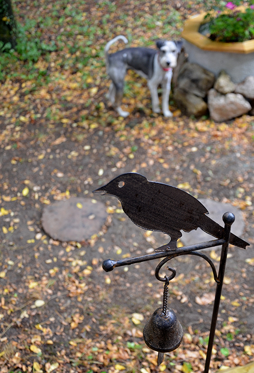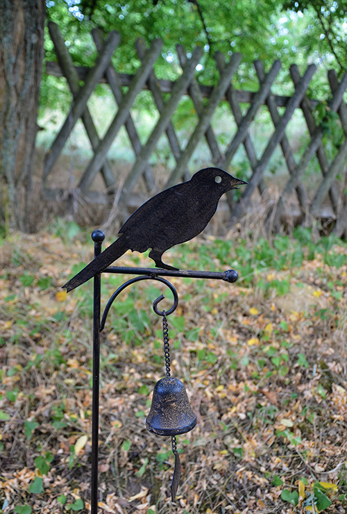 És, ha már a bejáratról van szó, akkor miért ne lehetne itt egy kedves kis csengő? Na, nem mintha nem lenne egy speciális, szőrös jelzőberendezésem, ha valaki érkezik (meg ahhoz egy másik kapun is be kell jutni előbb), de azt gondoltam, hogy ez a kis madaras csengettyű autentikus eleme lesz ennek a résznek.