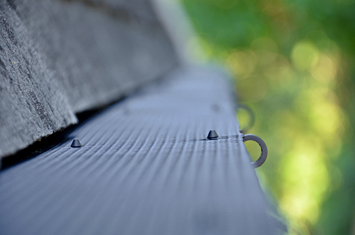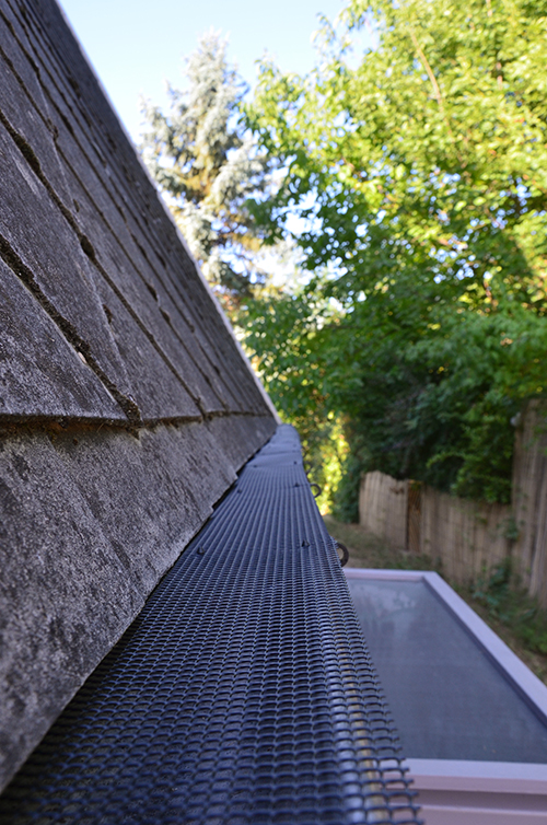 A palatető eléggé belelóg a csatornába, így nem lehetett egyszerűen csak végiggurítani a hálót, hanem mindig a pala éle alá kellett igazítani, és úgy rögzíteni a pántokra.