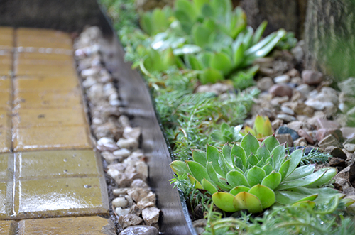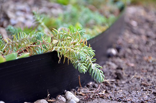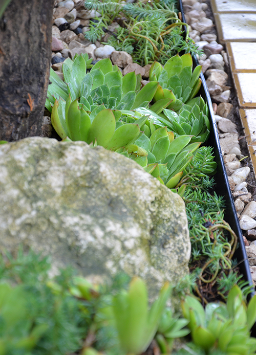 És igen! Végre megszűnt a sártenger a keramit úton. A gumiszalagot kavicsokkal, kövirózsákkal, varjúhájjal szegélyeztem, amiket a kert különböző pontjairól gyűjtögettem be, így egészen mutatós lett a végeredmény.
