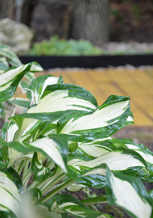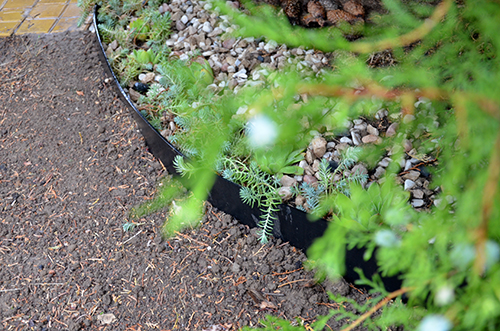 Azt a részt, ahol már éri a nap a talajt majd befüvesítem, de ez az idei nagy szárazság miatt eleve esélytelen lett volna. Mindenesetre a gumiszalagot ívesen elvezettem oldalra, a kerítés irányába. Ha egyszer lesz fű, megmutatom megint ezt a részt.