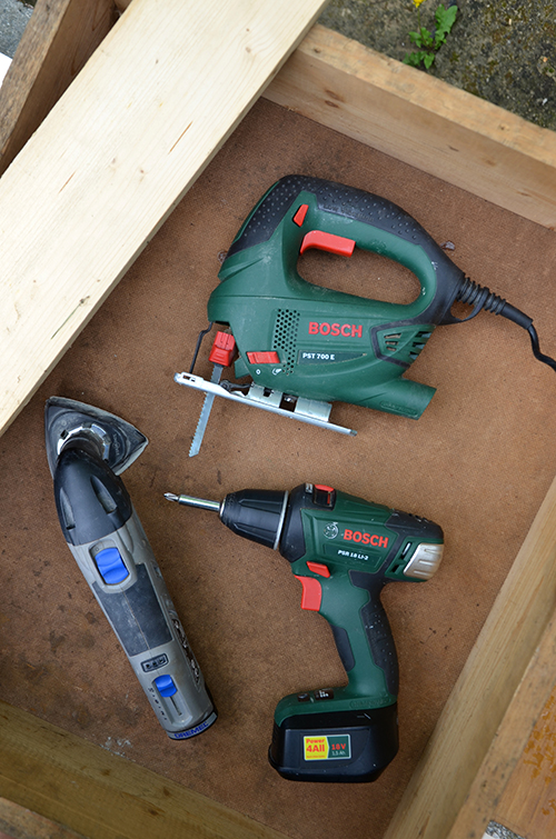 Első lépésként összeszedtem a szükséges alapanyagokat és eszközöket: a dekorpírfűrészt, a fúró/csavarozót, a deltacsiszolót, a lépcső (ITT) és hinta (ITT) festéséhez használt Poli-Farbe Boróka dió színű lazúrt, ecsetet, csavarokat és mérőszalagot.