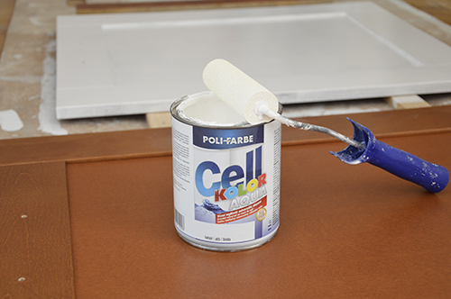 Szerencsére, most már nagyon jó tapadású alapozók is kaphatók, amik előtt nem feltétlenül szükséges csiszolni, pláne, ha a felület matt vagy selyemfényű. Bár az egyik kedvenc és bevált alapozóm továbbra is az Otex, amivel festettem már parkettát és lamináltat (ITT), járólapot (ITT), csempét (ITT), de egy jó ideje a Poli-Farbe Cellkolor aqua vízzel hígítható töltőalapozóját és vizes selyemfényű zománcát is használom és mivel nagyon jók a tapasztalataim, így ezúttal ezt a márkát használtam.