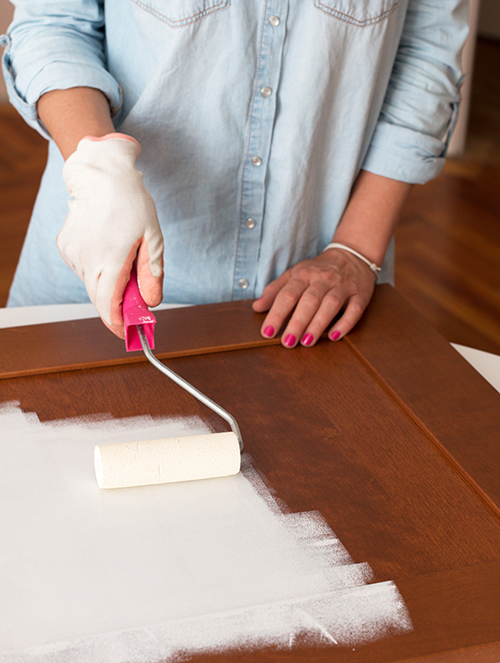 Első lépésként az alsó elemekkel kezdtem: ilyenkor célszerű minden elemet leszedni, a fogantyúkat eltávolítani és fektetve festeni a bútor lapjait. Festés előtt azonban mindig kötelező az alapos zsír- és pormentesítés, ezen nagyon sok múlik. Én zsíroldóval, súrolószerrel, dörzsi szivaccsal és körömkefével is sikáltam, hogy makulátlan legyen a festendő felület. Utána többször áttöröltem nedves ronggyal is, hogy a tiszítószerekből se maradjon rajta semmi.