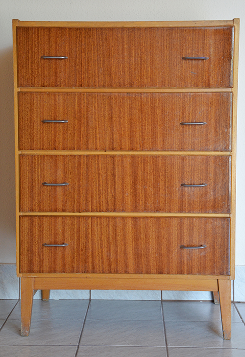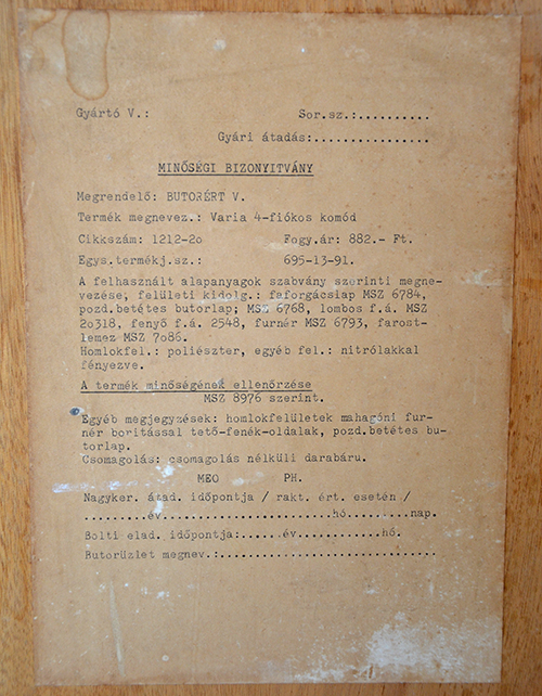 Egészen pontosan ez egy Varia 4-fiókos komód. A hátlapján lévő minőségi bizonyítvány eléggé lázba hozott, kár, hogy nincsenek kitöltve a pontozott részek, jó lenne tudni, pontosan mi volt a sorszáma, mikor adták el és melyik boltban…