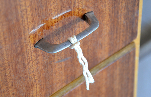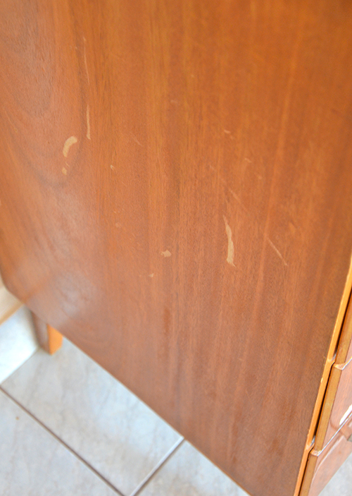 A fogantyúk épek, a fiók belsején lévő anyák szinte teljesen a frontlapba vannak süllyedve, így nehezen is lehetne őket eltávolítani. Nem is szerettem volna. Az oldala itt-ott sérült, karcos, eléggé észrevehető, szóval erről valahogy el kellett vinnem a fókuszt.
