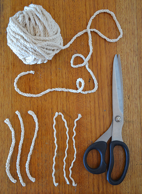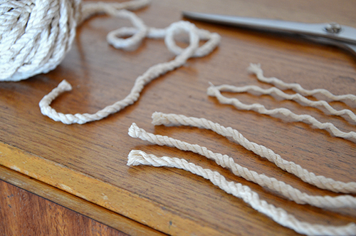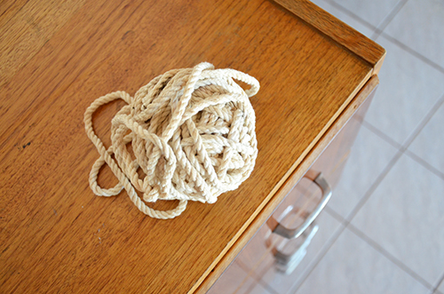 Elkezdtem hát körülnézni a pincében, miből dolgozhatok. A madzagok, spárgák, kötelek fiókjában megtaláltam annak a pamutzsinórnak a gombolyagját, amiből a fürdőszobai fogantyúk is készültek (ITT).