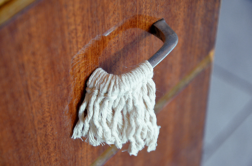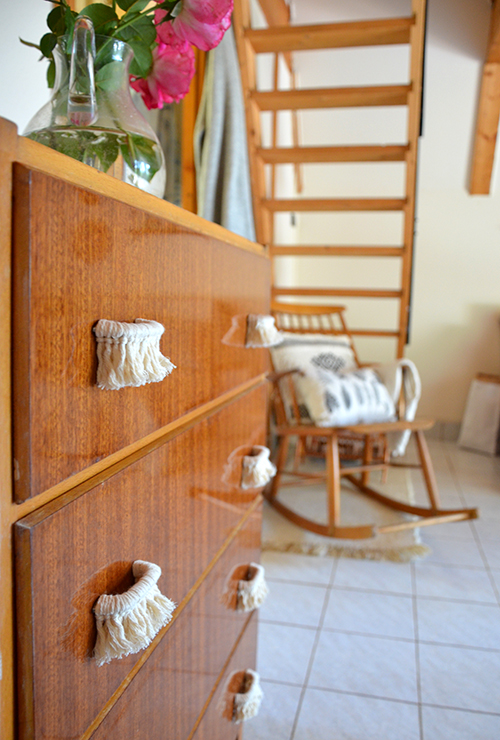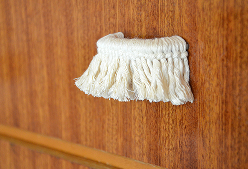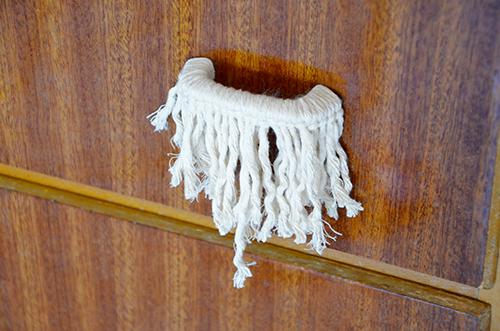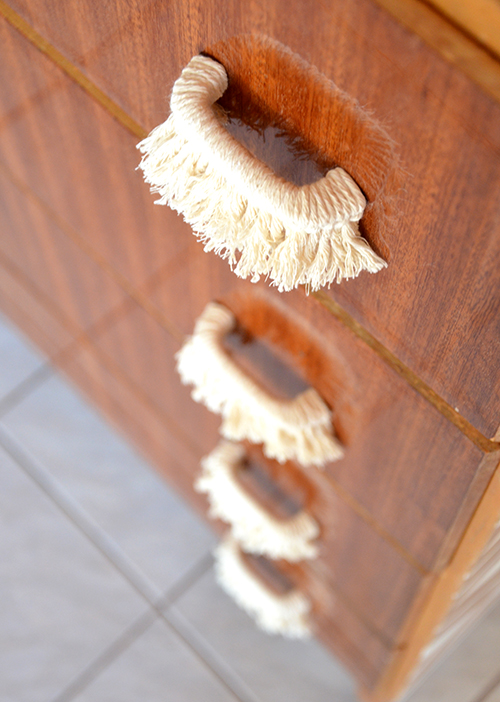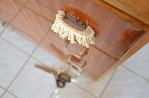 A vágás során a szálak maguktól még vékonyabb szálakra estek, de ezt sűrű fésűvel átsimogatva is el lehet érni. A 8 fogantyúra összesen 8×22 db hurok került, ami kb. egy órába telt. A szálak a tőnél elég szorosan feszülnek egymáshoz, így használat során sem bomlanak le, de egyébként a rojtok alatt ragasztópisztollyal rá lehet menni, én nem tettem. Ezeket a fiókokat azért nem napi szinten használom több alkalommal, szóval a koszosodástól egyelőre nem kell tartanom. Ha majd elkoszolódik cserélem, illetve lehet sötétebb színű zsinórt is használni.