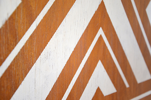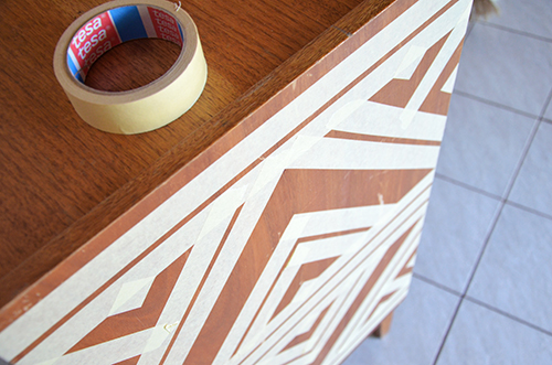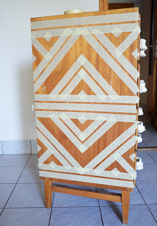 Maszkolószalaggal kitakartam az oldalát. Először a felső és alsó csíkokat ragasztottam fel, majd a középsőket, és végül a középvonalat egy-egy ponton jelölve jöhetett a többi. Nem vittem túlzott tervezésbe és méretegetésbe a dolgot, inkább a spontaneitásra és a szemmértékemre hagyatkoztam.