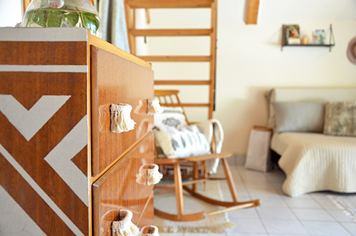 A komód színe nagyon jól összejön a faház érett fa árnyalataival és a hintaszékkel is.