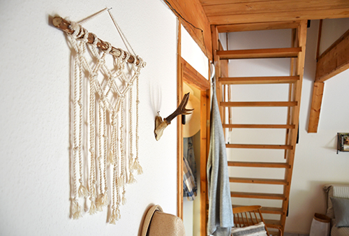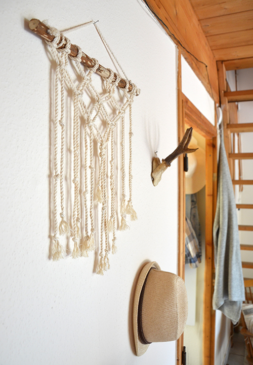 A maradék zsinorból készítettem a falra egy gyors „makramét”. Ha több anyagom marad, akkor szívesen elpepecseltem volna vele, mert kiskoromban elég jól kitanultam a csomózási technikákat. Most végre feleleveníthetném és hasznosíthatnám is, pláne, hogy a makramé kiegészítők és dekorációk eléggé divatosak az elmúlt években. A faágat a kertből hoztam, elszáradt bálványfa ága, sniccerrel megtisztogatva… Amúgy erdős terület lévén meglehetősen sok bálványfa van a kerítés mentén (ecetfaként használjuk inkább a köznyelvben, pedig az tulajdonképpen egy másik növény), de rendületlenül harcolok ellene és tövestől húzkodom kifele.