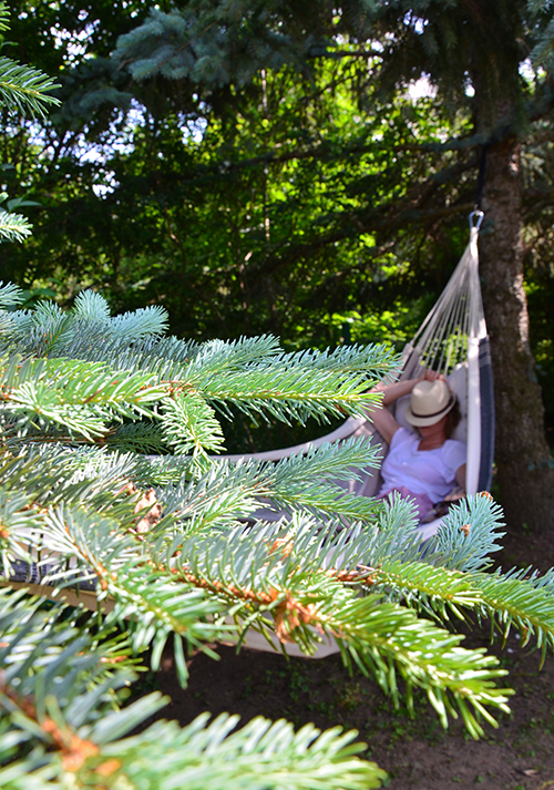 Ezt a vászon függőágyat még ősszel, szülinapomra kaptam, és alig vártam, hogy végre kipróbálhassam a kertben. Ehhez persze kellett két megfelelő távolságban elhelyezkedő és elég vastag törzzsel rendelkező fa. Szerencsére ilyen azért akadt a kertben. Mindkét fenyőfa törzsét kicsit megtisztogattuk, az elszáradt ágakat levágtuk, hogy könnyebben hozzáférjünk a törzs felső részéhez.