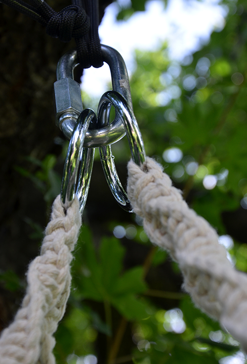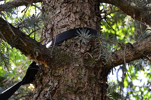 A törzs köré egy hevedert fűztünk. Ezt a függőágyhoz kaptam, de bármilyen erős heveder vagy kötél megfelel, amire rá lehet csiptetni a karabinert. Az én hevedereimnek a végén van egy-egy karika, ebbe könnyen bele lehet akasztani a karabinert. Arra az egyre kell csak figyelni, hogy a karabiner terhelhetősége megfelelő legyen, inkább menjetek biztosra, és válasszatok jó erőset!