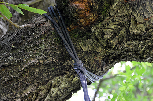 A faág köré erős, jó teherbírású kötelet tekertünk, majd csomóra kötöttük és hurkoltuk a lelógó végét. Ebbe közvetlenül akasztható a karabiner, de itt is jó megoldás ez köztes karika.
