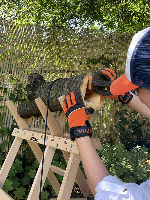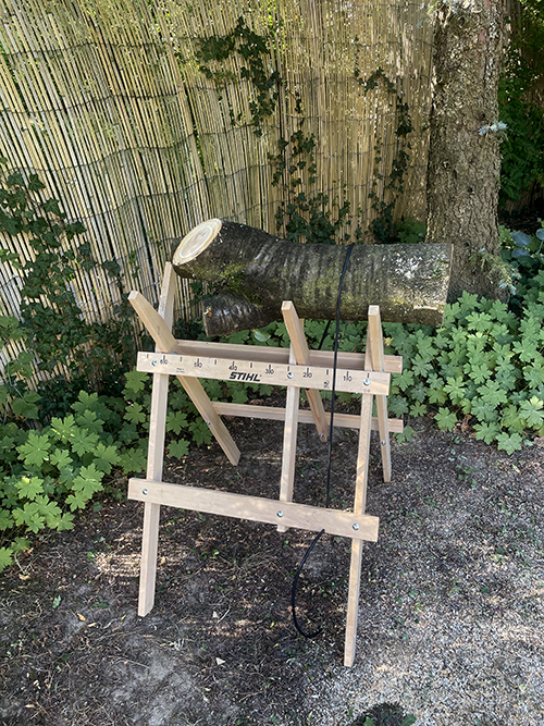 A kert legárnyékosabb részén alakítottam ki a kerti műhelyt, ahol felállítva a fűrészbakot rögtön neki is láttam a feladatnak.