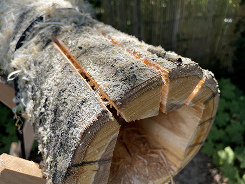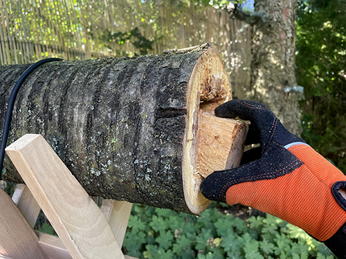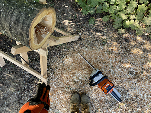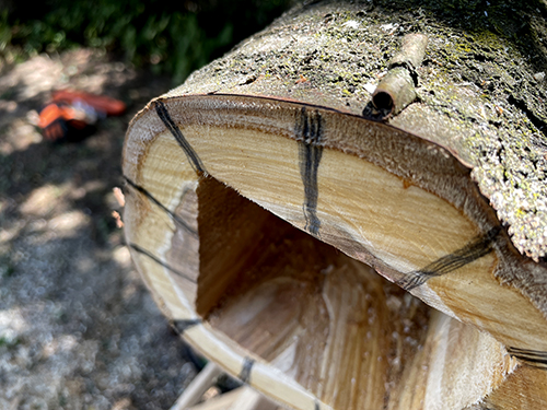 Nekem végül az lett a taktikám, hogy mindig forgattam 90 fokot a rönkön, így egy-egy élét szépen be tudtam vágni, és egy kisebb – gúlának azért nem egészen mondható – darabot ki tudtam emelni. Ezután folytattam a forgatást, és így ugyan lassan, de végül egészen szépen kifaragtam a belső üreget.