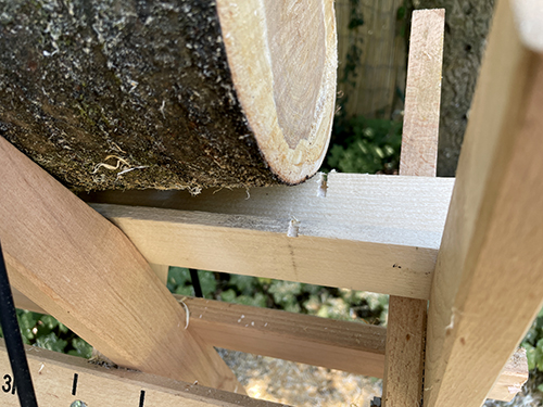 Majd mérete vágás után a rönk másik oldalán is bevagdostam a réseket. Szintén fontos részlet az is, hogy a fűrészbakra ehhez 1-1 segédlécet kellett rakni. Mivel alapvetően a fűrészbakon kívül, a rönk túlnyúló részén szoktuk a munkát végezni, ezért ha rajta végezzük, akkor a bak épsége érdekében kellenek ezek a lécek, nehogy véletlenül a bakot is kettévágjuk.