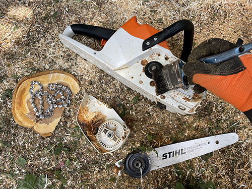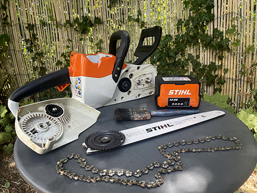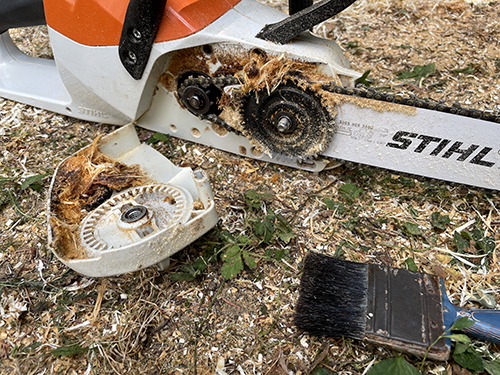 A gépet nagyon könnyű szétszedni, így könnyen hozzáférhetünk ahhoz a részhez, amit a munka végeztével meg szeretnénk tisztítani. Ezt is kesztyűben végezzétek, mert a lánc éles fogazata könnyen ejthet sebet álló helyzetben is. Tapasztalatból mondom…