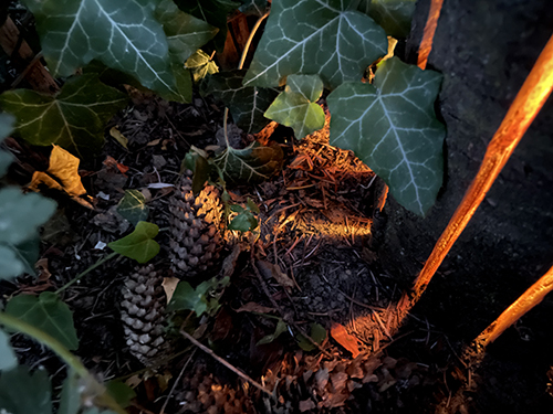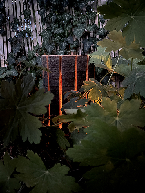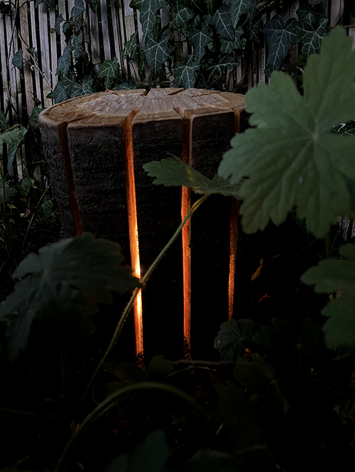 Sötétben persze nehéz fotózni, de azért remélem, a képek átadják a hangulatot. Élőben nagyon jól mutat a borostyán és a gólyaorr ölelésében a rönk bevágásain keresztül kiszűrődő fény.