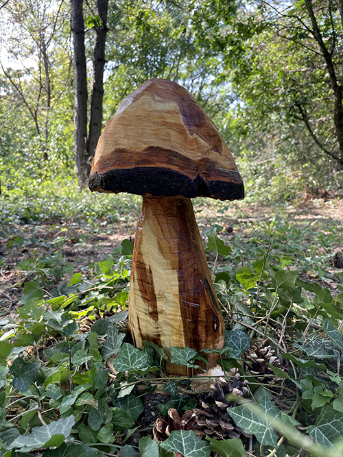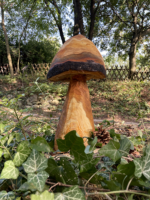 A nagyjából 14-15 cm magas hengerből alakítottam ki a gomba kalapját úgy, hogy először fentről lefelé, belülről kifelé végeztem a vágásokat, majd a finomabb vonalak kialakítását ismét alulról felfelé csináltam.